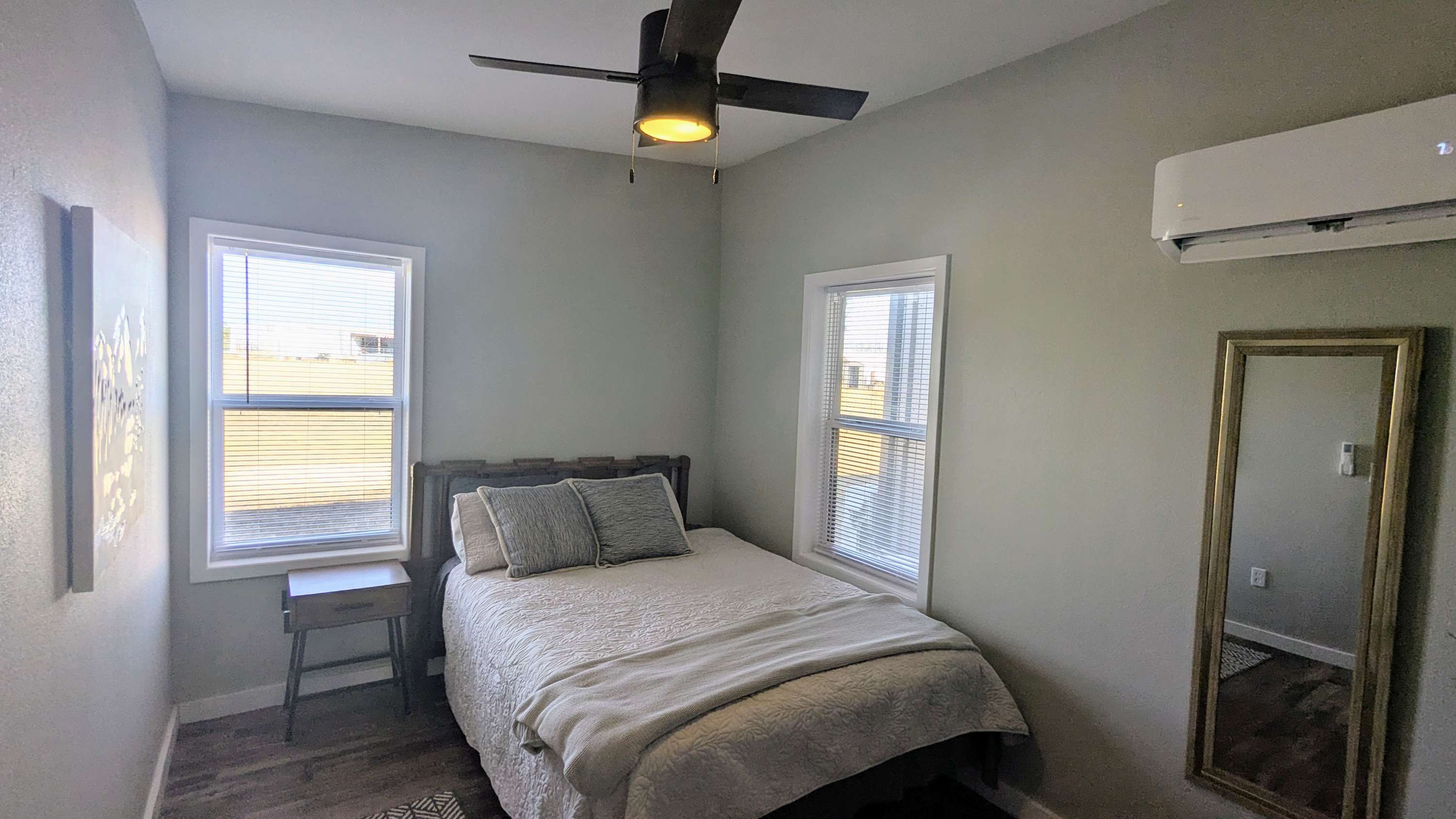 Modern 1-bedroom, 1-bath suite that accommodates up to 4 guests. The bedroom features a comfortable bed with soft linens for a restful night's sleep. The open-plan living area blends the kitchen, dining area, and living room into a spacious setting. A pull-out couch provides additional sleeping space. Thoughtfully designed with stylish furnishings and modern decor. Large windows fill the suite with natural light.